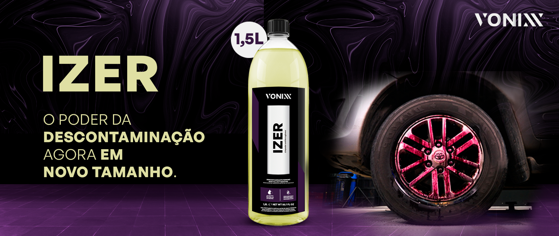 O IZER 1,5L da Vonixx é um descontaminante ferroso com pH neutro, desenvolvido para remover partículas de ferro, fuligem de travões e oxidação leve em rodas, pintura automóvel e outras superfícies metálicas. A sua ação química avançada reage com contaminantes ferrosos, transformando-se em coloração roxa, o que permite visualizar claramente a eficácia do produto.